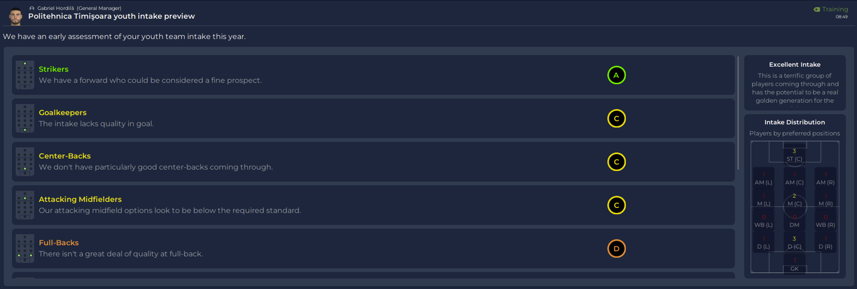 As I mentioned previously, this is my second attempt at a ‘Youth Only’ save, the first was with a club in Croatia. In that save, we did not make it out of the 2nd Division, and as a result, the club went semi-professional. 2nd year we got promoted, the owners would not let us go pro, so the 3rd year we barely avoided relegation. 4th year we were still semi pro, and the Youth Intakes had not been good enough yet to produce any wonderkids that could help us, some solid talent but no ‘Good/Great’ Talents, and halfway thru the season, on a losing streak, the owners demanded 9 points from 6 games that included Dinamo Zagreb, Hadkuk Split, Rijeka, Rudes, and Slavan Belupo, and 4 games later I was shown the door. The kicker to all of this was that the club was secure in it’s finances, the decisions to go Semi Pro was made under the hood, and so were the following decisions to not go pro again. Did not being professional hurt us? Not as much as I wanted it to in hindsight, the one thing it really affected was training, as two sessions a week is not and never will be as good as seven sessions a week. And it could be some internal biases at play, but the Romanian Lower Leagues just seem to be more ‘solid’ than the Croatian ones. Then again, with as many lower leagues division as Romania has, maybe they should be.